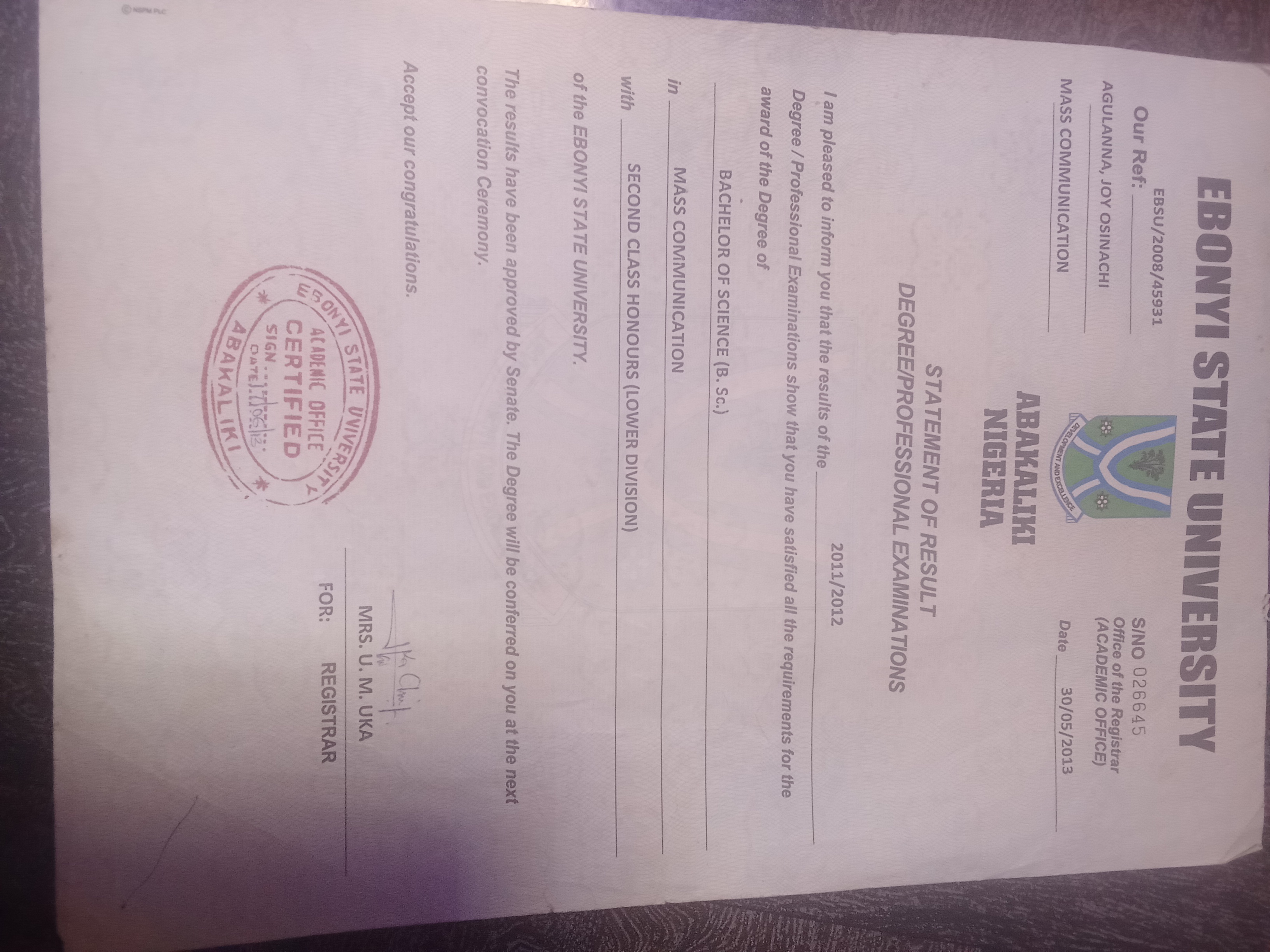 A graduate from Ebonyi State University, studied Mass Communication with specialization in English language and writing