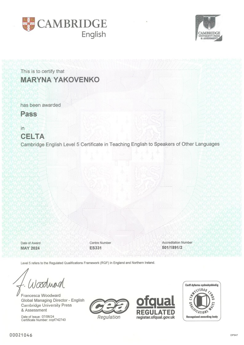 I am a CELTA-certified English teacher with over 3 years of experience teaching children, teenagers, and adults. I create structured but engaging lessons adapted to students’ age, level, and goals. I use a communicative approach to teaching English as a second language. My lessons focus on speaking and real-life communication, while also developing grammar, vocabulary, listening, reading, and writing skills. I focus on communicative, student-centred learning. I aim to create a supportive and engaging atmosphere where students feel confident and motivated to speak English from the very first lesson.